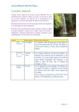 El documento describe las opciones de turismo natural que ofrece Uruguay, incluyendo espacios de gran pureza ambiental libres de contaminación donde se puede respirar aire puro, escuchar aves silvestres y disfrutar de la vegetación y paisajes extraordinarios. El turista puede realizar actividades como paseos a caballo, acampar en lugares agrestes, caminar por el campo u observar atardeceres. Además, menciona tres lugares específicos para el turismo natural: el Salto del Penitente cerca de Minas, la Quebra