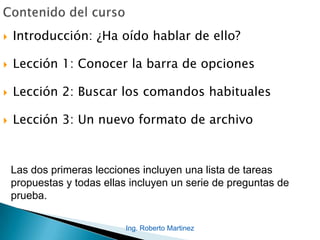 Este documento proporciona instrucciones sobre cómo encontrar y usar los comandos más comunes en Word 2007. Explica que muchos comandos de formato como negrita, cursiva y estilos se encuentran en la ficha Inicio. También muestra dónde encontrar opciones para insertar imágenes, tablas e hipervínculos en la ficha Insertar, y dónde revisar la ortografía y gramática o imprimir documentos en las fichas Revisión y Diseño de página respectivamente. El documento ofrece consejos sobre cómo utilizar la barra