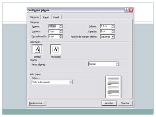 El documento describe varias maneras de buscar archivos en Windows, incluyendo buscar por título, contenido o propiedades. También explica cómo establecer márgenes de página, usar la vista previa, imprimir documentos, y utilizar las funciones de edición como cortar, copiar y pegar.