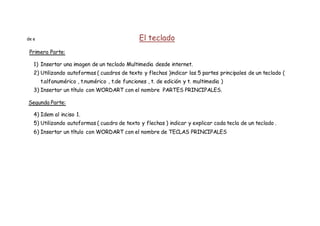 El documento describe las partes y teclas principales de un teclado. Se divide en dos partes, la primera identifica las cinco partes principales de un teclado (teclado alfanumérico, numérico, de funciones, de edición y multimedia) y la segunda explica las funciones de varias teclas importantes como retroceso, suprimir, flechas de desplazamiento, mayúsculas y números.