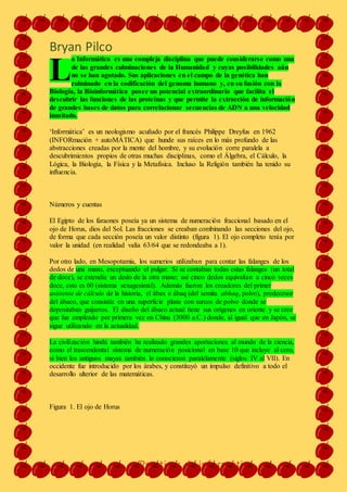Este documento resume la historia de la informática y la computación desde sus orígenes más antiguos en civilizaciones como Egipto y Mesopotamia, que desarrollaron sistemas de numeración, hasta los avances más modernos en el siglo XIX y XX. Se destacan invenciones clave como el ábaco, el sistema decimal posicional, las primeras calculadoras mecánicas como la máquina diferencial de Babbage, y el desarrollo de la lógica booleana y los circuitos eléctricos que sentaron las bases de la comput