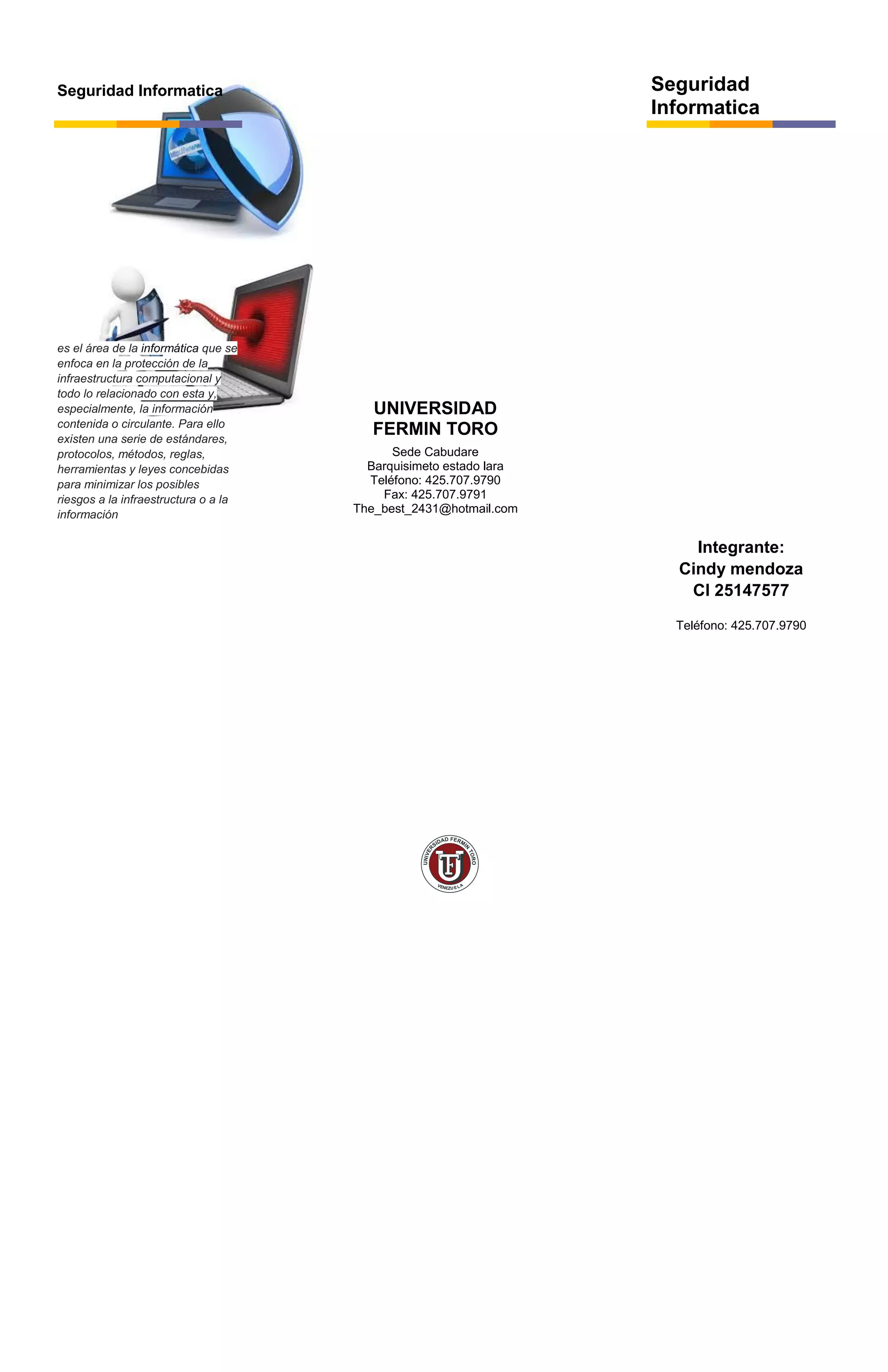 El documento habla sobre la seguridad informática. Explica que la seguridad informática se enfoca en proteger la infraestructura computacional y la información almacenada o que circula a través de estándares, protocolos, métodos y leyes. También define la seguridad informática como la disciplina que diseña normas y procedimientos para lograr un sistema de información seguro y confiable. Finalmente, menciona que la seguridad en una red implica identificar y eliminar vulnerabilidades para salvaguardar los activos de una organización.