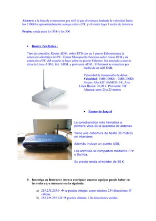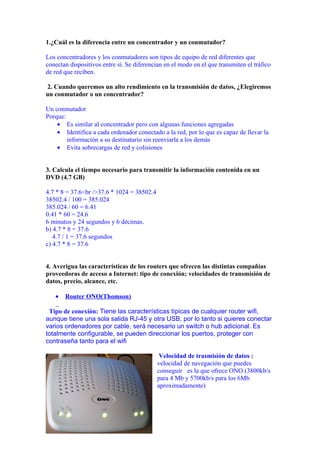 Este documento compara concentradores y conmutadores, explica que un conmutador es mejor para el alto rendimiento de transmisión de datos porque identifica cada ordenador conectado y envía la información directamente sin reenviarla. También incluye instrucciones para calcular el tiempo de transmisión de un DVD, averiguar las características de routers de proveedores de internet, y explica comandos para configurar y comprobar la red.