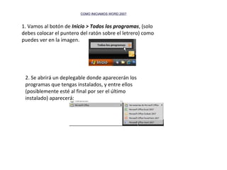 Este documento describe la interfaz de usuario de Microsoft Word 2007, incluyendo cómo iniciar el programa, las diferentes barras y bloques que componen la interfaz, y cómo realizar tareas comunes como crear un nuevo documento, guardar un documento existente, e inspeccionar la interfaz.