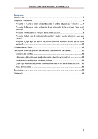 El documento resume el uso de las redes sociales en el ámbito educativo y formativo. Explica que las redes sociales y herramientas como blogs, wikis y foros permiten nuevas formas de aprendizaje colaborativo y construcción del conocimiento. También cambian los roles de los profesores, quienes guían a los estudiantes en el uso responsable de las redes para desarrollar competencias para el siglo XXI. Las redes pueden crear comunidades virtuales que facilitan el intercambio de información para apoyar los procesos de