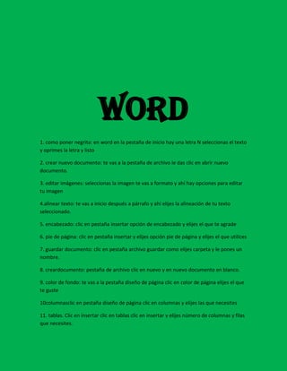 Este documento proporciona instrucciones para descargar e instalar Microsoft Word desde un CD y para realizar varias tareas básicas en Word como poner texto en negrita, crear un nuevo documento, editar imágenes, alinear texto, agregar encabezados, pies de página, guardar documentos, crear documentos en blanco, cambiar el color de fondo de página, agregar columnas y tablas, y cambiar de usuario.