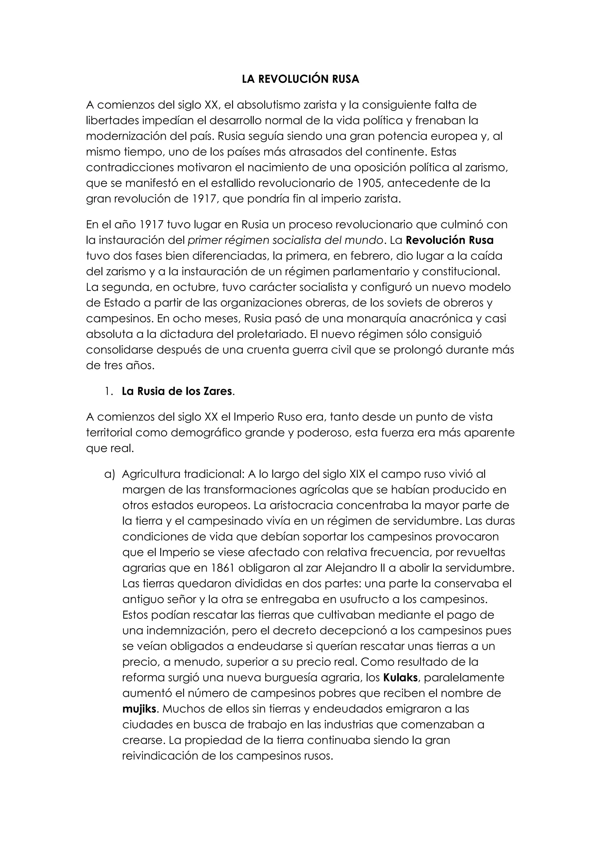 La revolución rusa de 1917 puso fin al Imperio Ruso y estableció el primer Estado socialista del mundo. La revolución tuvo dos fases: en febrero, las protestas derrocaron al zar y establecieron un gobierno provisional burgués. En octubre, los bolcheviques tomaron el poder mediante una insurrección pacífica y establecieron el Sóviet de Comisarios del Pueblo liderado por Lenin. Sin embargo, el nuevo régimen enfrentó una cruenta guerra civil de tres años contra fuerzas antirrevolucionari