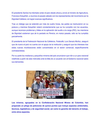 El Gobierno de Colombia enfrenta nuevas movilizaciones y paros de diferentes sectores como mineros, cafeteros y campesinos, que ponen en jaque al presidente Santos. Los mineros anunciaron un paro indefinido desde el miércoles para exigir el cumplimiento de acuerdos anteriores, mientras que los cafeteros también se movilizarán el 19 de agosto. Los diálogos con los campesinos del Catatumbo, que llevan 38 días en protesta, se mantienen estancados.