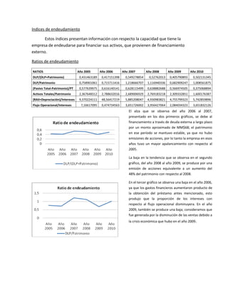 La empresa experimentó un aumento significativo de su deuda a largo plazo entre 2006 y 2007, lo que elevó sus niveles de apalancamiento. Entre 2008 y 2009, la emisión de nuevas acciones aumentó el patrimonio y redujo el apalancamiento. La rentabilidad de la empresa disminuyó entre 2009 y 2010 debido a mayores gastos y menores márgenes brutos, a pesar del aumento en las ventas. La liquidez también se redujo durante este período.