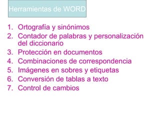Este documento describe varias herramientas de Microsoft Word como la ortografía y sinónimos, el contador de palabras, la protección de documentos, las combinaciones de correspondencia, las imágenes en sobres y etiquetas, y la conversión de tablas a texto.