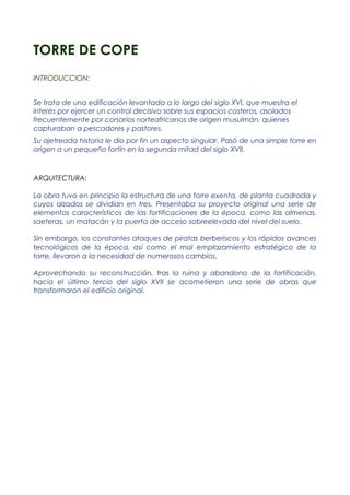 La Torre de Cope era originalmente una torre cuadrada del siglo XVI construida para controlar el litoral y proteger a los pescadores y pastores de los ataques de los corsarios musulmanes. Sufrió numerosos cambios a lo largo de los siglos debido a los constantes ataques piratas y avances tecnológicos, transformándose en un pequeño fortín en el siglo XVII.