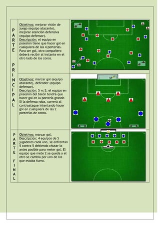 El resumen describe una sesión de entrenamiento de fútbol con cuatro partes. La parte inicial se centra en el control del balón y los desmarques. La parte principal trabaja la condición física, el manejo del balón y ejercicios de pases y remates a portería. Luego se realizan ejercicios enfocados en la visión de juego y la atención defensiva. La parte final consiste en partidos 5 contra 5 para marcar goles. El entrenamiento concluye con estiramientos.