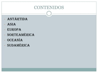 Este documento presenta una lista de seis regiones geográficas (Antártida, Asia, Europa, Norteamérica, Oceanía y Sudamérica) y destaca un lugar notable de cada una, incluyendo la cabaña de Scott en la Antártida, el Santuario de Itsukushima en Japón, la Catedral de Colonia en Alemania, el Gran Cañón del Colorado en Estados Unidos, la Gran Barrera de Coral en Australia y la ciudad de Ouro Preto en Brasil.