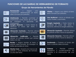 Este documento describe las funciones de las barras de herramientas de formato para fuente y párrafo. La barra de herramientas de fuente permite cambiar el tamaño, estilo, color y otras propiedades del texto. La barra de herramientas de párrafo permite controlar la alineación, sangría, numeración, viñetas y otros formatos de los párrafos. Ambas barras contienen varias opciones para dar formato al texto.