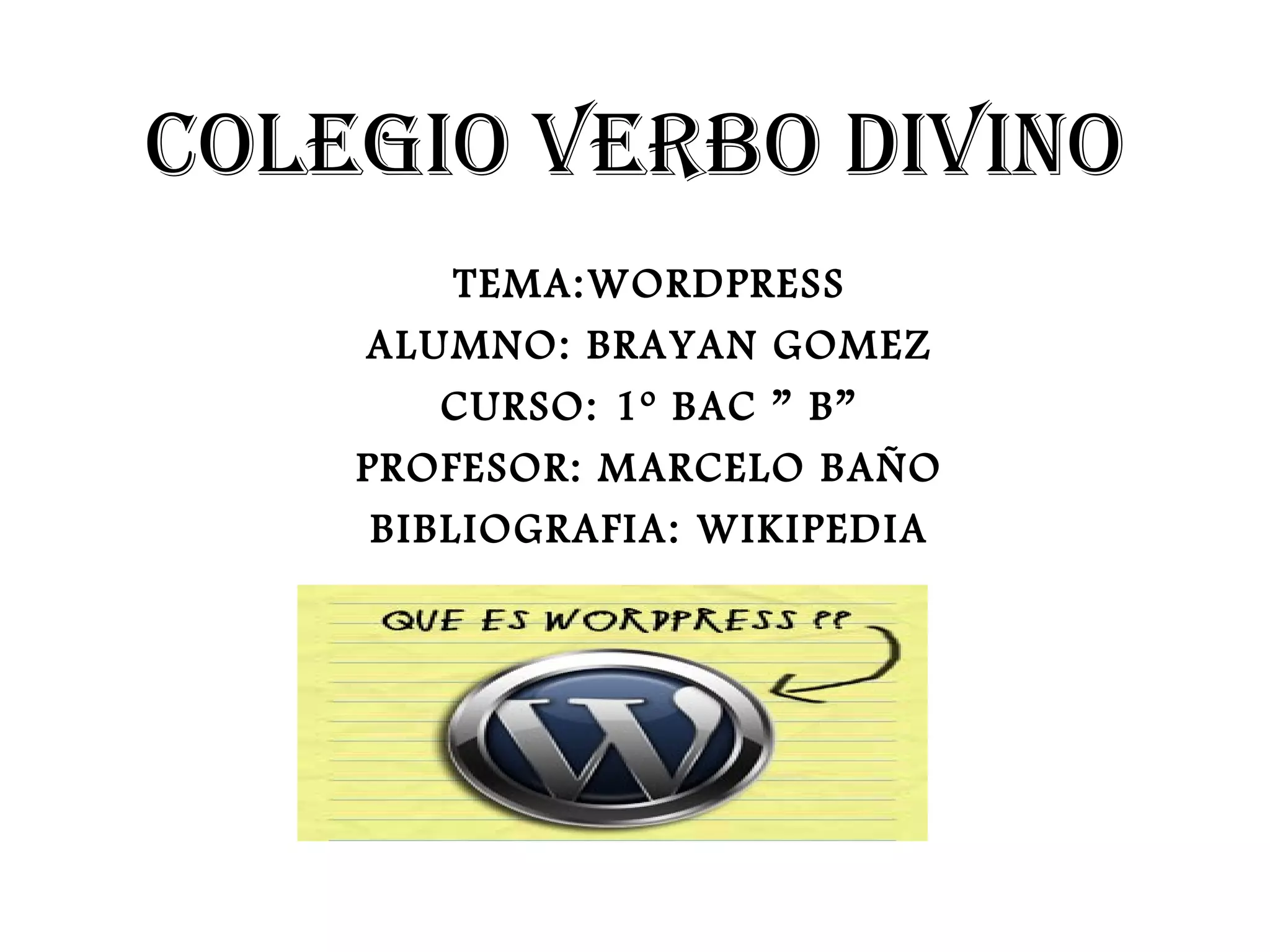 WordPress es un sistema de gestión de contenidos enfocado a la creación de blogs. Fue creado en PHP y MySQL y es el CMS más popular para blogs y sitios web. Es fácil de usar e instalar y cuenta con una gran comunidad de desarrolladores que crean plugins y temas. Para usar WordPress, se crea una cuenta en wordpress.com, se llenan los datos requeridos y se aceptan las condiciones. Luego, se publican nuevas entradas redactando el contenido y agregando elementos multimedia.