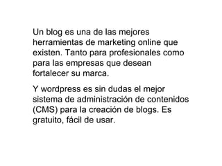 El documento describe los pasos para crear un blog en WordPress, incluyendo elegir un nombre de dominio, seleccionar un hosting, instalar y configurar WordPress. Explica cómo registrarse en WordPress.com, elegir un diseño, y agregar la primera entrada. También incluye los pasos para cambiar el tema de WordPress.