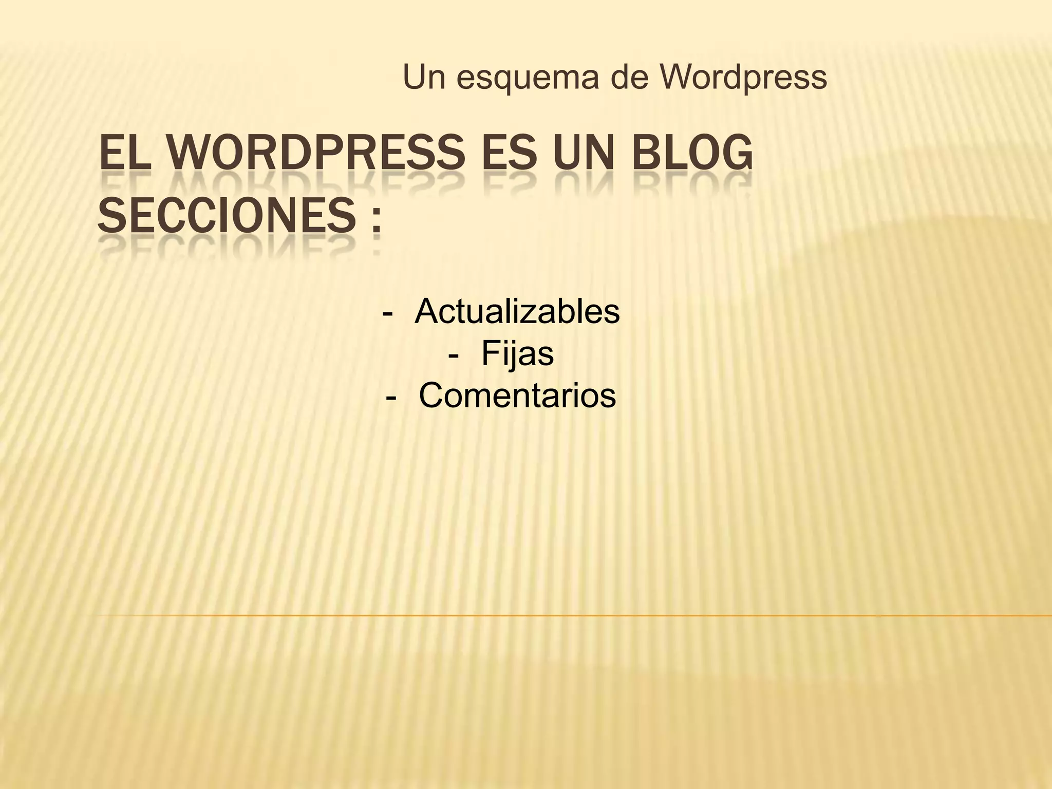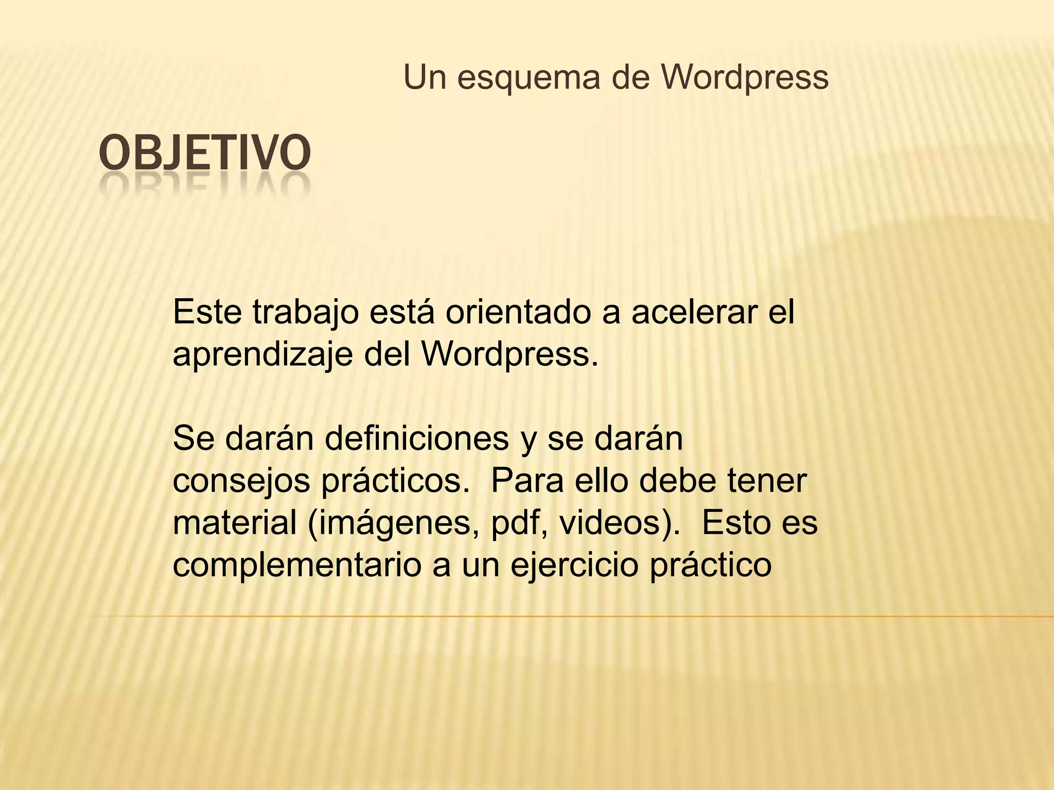 Este documento presenta un esquema paso a paso para aprender a usar WordPress. Explica conceptos clave como entradas, páginas, widgets y temas. Detalla los pasos para configurar la apariencia, agregar contenido como entradas y páginas, categorizar la información, y distribuir widgets. El objetivo es acelerar el aprendizaje de WordPress mediante definiciones, consejos prácticos y una guía secuencial.
