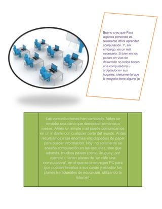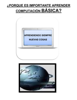 El documento discute por qué es importante aprender computación básica. Explica que la comunicación y el acceso a la información han cambiado debido a la tecnología, por lo que aprender computación es casi un requisito para el trabajo y la educación. Además, en un mundo cada vez más globalizado y tecnificado, el aprendizaje de la computación es una necesidad imperiosa.