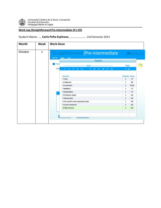 La estudiante Carla Peña Espinoza completó un registro de trabajo (work log) para su curso de Pedagogía Media en Inglés en la Universidad Católica de la Ssma. Concepción durante el segundo semestre de 2013, en el cual describió brevemente las tareas realizadas para cada semana del curso en octubre y noviembre.