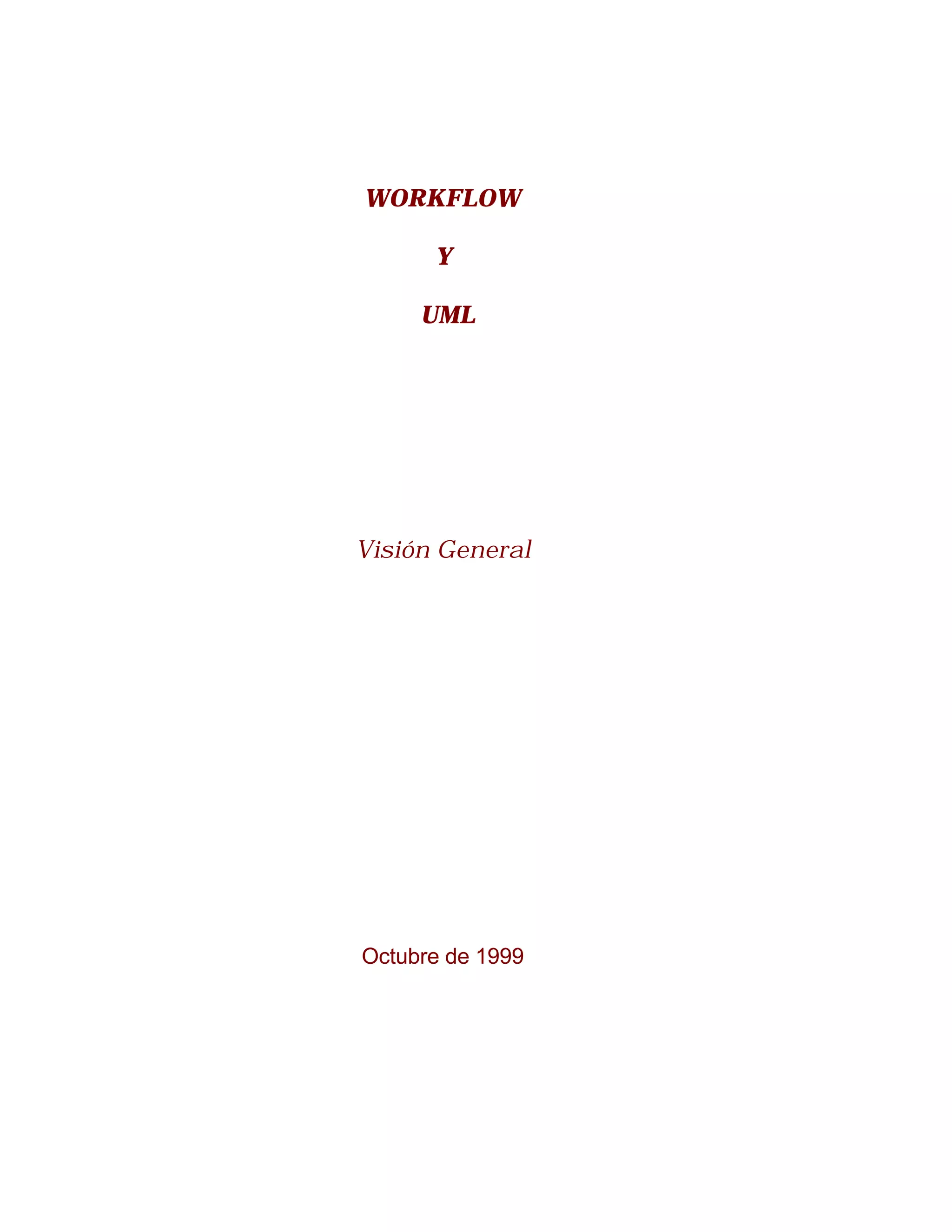 El documento provee una introducción a los conceptos de Workflow y UML. Explica que Workflow se refiere a la automatización de procesos empresariales mediante el paso de documentos e información entre participantes de acuerdo a reglas predefinidas. También describe la evolución de Workflow, desde procesos manuales hasta su automatización actual. Finalmente, introduce el Lenguaje Unificado de Modelado (UML) y cómo puede usarse para modelar casos de uso y actividades de Workflow.