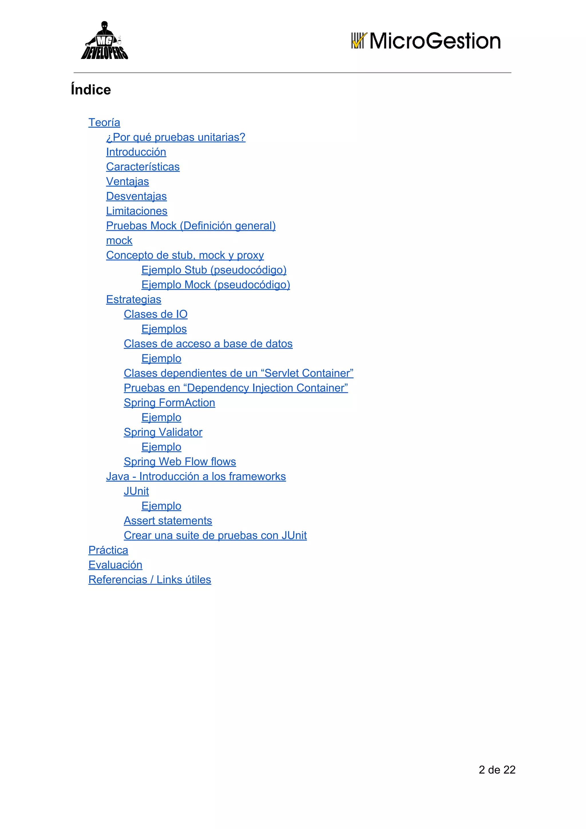 Este documento trata sobre pruebas unitarias. Explica por qué son importantes las pruebas unitarias, sus características, ventajas y limitaciones. También describe los conceptos de pruebas mock, stub, mock y proxy, y provee ejemplos de cómo usarlos. El documento contiene información teórica sobre pruebas unitarias y marcos de prueba como JUnit, así como una sección de práctica y evaluación.