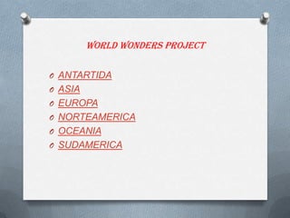 Este documento presenta un proyecto sobre las maravillas del mundo realizado por estudiantes del Colegio Nicolás Esguerra. El proyecto incluye secciones sobre Antártida, Asia, Europa, Norteamérica, Oceanía y Sudamérica, con una breve descripción de una atracción turística seleccionada en cada región.