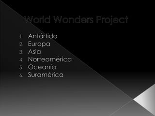 El documento presenta información sobre varios lugares históricos alrededor del mundo, incluyendo la cabaña de Scott en la Antártida, el periodo en que los Papas residieron en Aviñón, Francia, la ciudad de Kioto como centro de la arquitectura japonesa, la ciudad colonial canadiense de Luxemburgo dedicada a la pesca y construcción naval, el Parque Nacional de Kakadu en Australia repleto de historia humana y natural, y la aldea de Diamantina en Brasil que floreció durante la extracción de diamantes.