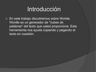Wordle es una aplicación en línea gratuita que genera nubes de palabras a partir de cualquier texto introducido por el usuario. Las nubes de palabras resaltan las palabras más frecuentes a través de diferentes tamaños y colores. Los usuarios pueden personalizar el formato, fuente y diseño de las nubes y compartirlas o imprimirlas. Wordle puede usarse en el aula para visualizar el vocabulario más utilizado por los estudiantes a lo largo de un semestre.
