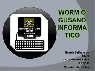 Los gusanos informáticos se propagan a través de redes mediante archivos adjuntos en correos electrónicos y pueden infectar miles de equipos en horas. Son programas que se reproducen a sí mismos sin necesidad de software o hardware adicional y el mejor método para protegerse es no abrir archivos adjuntos sin precaución. Programas antivirus gratuitos como AVG, Antivir y Avast pueden eliminar gusanos e infectaciones.