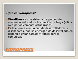 WordPress es un sistema de gestión de contenido para crear blogs y sitios web. Fue creado originalmente por Matt Mullenweg en 2003 y se ha desarrollado desde entonces gracias a contribuciones de una gran comunidad de desarrolladores y diseñadores voluntarios. WordPress permite publicar contenido en forma de entradas ordenadas por fecha y páginas estáticas, y separa el contenido del diseño mediante el uso de plantillas de XHTML y CSS.