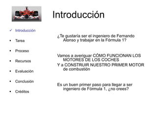 Este documento presenta una webquest sobre motores de combustión interna dirigida a estudiantes de 3o de ESO. La webquest guía a los estudiantes a través de varias actividades para aprender sobre partes clave de motores, su funcionamiento y construir un modelo básico. El objetivo final es que los estudiantes comprendan los conceptos básicos necesarios para ser ingenieros automovilísticos como los de Fernando Alonso.