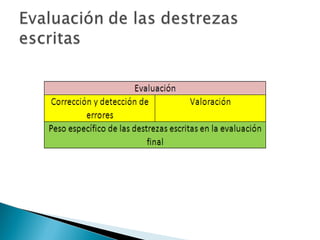 Este documento describe las ventajas de la escritura para el aprendizaje de un idioma. Explica que la escritura proporciona una práctica intensiva del vocabulario y la gramática en un contexto comunicativo. Además, la escritura interactúa con la lectura y es fundamental para el estudio de cualquier asignatura en un segundo idioma. Finalmente, señala que la escritura puede ser divertida y un descubrimiento de la belleza a través de las palabras.