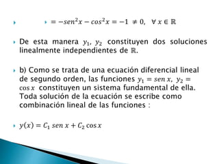El documento aborda la definición del wronskiano y su aplicación para determinar la independencia lineal de funciones. Se analizan ejemplos con diferentes funciones, mostrando cuándo el wronskiano es cero y cómo esto no siempre implica dependencia lineal. Se concluye que algunas funciones pueden ser independientes a pesar de que su wronskiano sea cero.