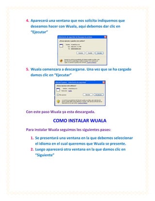 Este documento proporciona instrucciones para descargar, instalar y configurar la aplicación Wuala en un computador. Explica los pasos para descargar e instalar el software, crear una cuenta de usuario en Wuala y subir archivos a la cuenta.