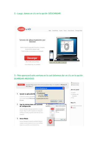 Wuala es un servicio de almacenamiento en línea que permite realizar copias de seguridad y almacenar archivos de forma segura, con cifrado y opciones de sincronización en múltiples dispositivos. Los usuarios pueden compartir archivos con acceso controlado y deben seguir un proceso específico para descargar e instalar el programa. Además, el usuario puede cargar fácilmente sus archivos a la plataforma después de crear una cuenta gratuita.