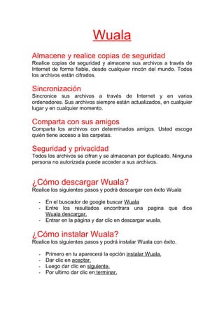 Wuala permite almacenar y respaldar archivos en línea de manera segura, encriptando y sincronizando datos en múltiples dispositivos. Los usuarios tienen control sobre el acceso a sus archivos y pueden compartirlos con amigos seleccionados. El documento también incluye instrucciones detalladas sobre cómo descargar, instalar y crear una cuenta en Wuala.