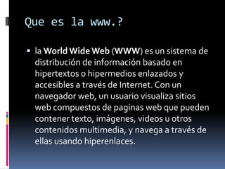 Que es la www.?la WorldWide Web (WWW) es un sistema de distribución de información basado en hipertextos o hipermedios enlazados y accesibles a través de Internet. Con un navegador web, un usuario visualiza sitios web compuestos de paginas web que pueden contener texto, imágenes, videos u otros contenidos multimedia, y navega a través de ellas usando hiperenlaces.