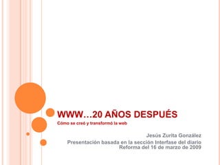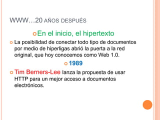El documento detalla la evolución de la web desde su creación por Tim Berners-Lee en 1989 hasta la actualidad, destacando hitos importantes como el lanzamiento de navegadores gráficos, la popularización de servicios como Hotmail y las redes sociales, y la llegada de la web 3.0. Se menciona cómo la web ha transformado la comunicación y el acceso a la información a través de innovaciones tecnológicas. La discusión concluye enfatizando la anticipación de una internet más inteligente y adaptativa en el futuro.