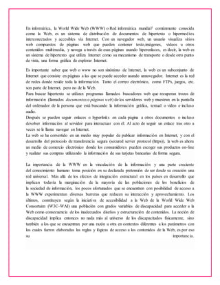 La World Wide Web (WWW) o Red Mundial de Información es un sistema de distribución de documentos hipertextuales e hipermedios interconectados accesibles a través de Internet. La WWW utiliza hiperenlaces para navegar entre páginas web que contienen texto, imágenes, videos y otros contenidos. Aunque la WWW es parte de Internet, no son sinónimos, pues Internet incluye otros servicios como correo electrónico y FTP. Los buscadores web recuperan páginas de los servidores para mostrar la información al usuario. La