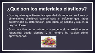Este documento describe los materiales elásticos y cómo se sintetizan. Explica que los materiales elásticos son aquellos que pueden deformarse y recuperar su forma original, y que siguen la Ley de Hooke. Estos incluyen polímeros naturales como la celulosa y sintéticos como el polietileno. Los polímeros se forman por la unión de moléculas pequeñas llamadas monómeros. La síntesis de materiales elásticos implica procesos de polimerización como la adición o condensación, en los