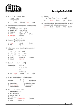El documento consiste en una lista de 18 problemas matemáticos sin resolver. Los problemas incluyen ecuaciones, expresiones algebraicas, potencias y raíces, y operaciones con números enteros y reales.