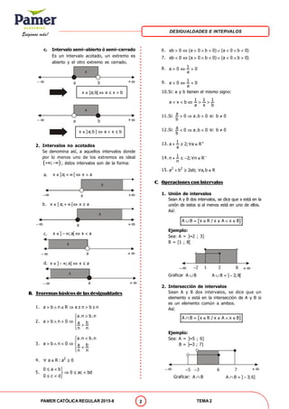 1) El documento presenta conceptos fundamentales sobre desigualdades e intervalos en números reales, incluyendo definiciones de desigualdades estrictas y no estrictas, tipos de intervalos (acotados y no acotados), y operaciones básicas con intervalos como unión, intersección y diferencia.