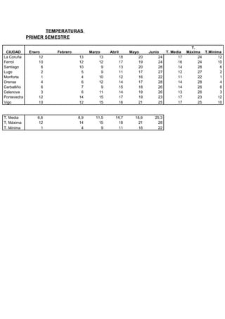 El documento presenta las temperaturas medias, máximas y mínimas de varias ciudades gallegas durante el primer semestre del año. Santiago, Lugo y Monforte son las ciudades más frías en enero y febrero, mientras que Orense y Carballiño son las más cálidas. En general, las temperaturas van aumentando a lo largo del semestre, siendo junio el mes más caluroso de la región.
