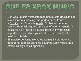 Microsoft lanza Xbox Music, un servicio de música en streaming con acceso gratuito a decenas de millones de canciones en varios dispositivos como Windows 8, Windows Phone 8 y Xbox 360. El servicio ofrece opciones de escucha bajo demanda gratuita o por suscripción de pago de 9,99€ al mes para escuchar sin anuncios. Xbox Music estará disponible inicialmente en estos dispositivos y se expandirá a otras plataformas en los próximos meses.