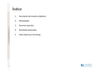 Este documento presenta los resultados de un estudio sobre la usabilidad y experiencia de usuario de cinco sitios web de viajes en España. El estudio encontró que los usuarios suelen comparar entre 3 y 5 sitios antes de decidirse por uno, y que el precio y la experiencia de usuario son factores clave. También descubrió que los usuarios a menudo usan sitios de viajes generalistas para buscar información inicial sobre destinos y precios antes de comprar directamente con aerolíneas u hoteles. Rumbo y Muchoviaje resultaron ser los sitios más efect