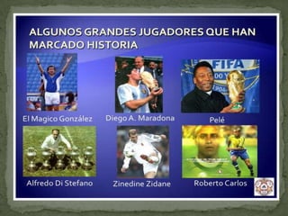 El documento habla sobre la historia y evolución del fútbol. Explica que el fútbol se jugó por primera vez en Egipto en el siglo III a.C. y que la pelota de cuero fue inventada en China en el siglo IV a.C. Luego describe cómo el juego se fue expandiendo a otras culturas como la griega y la romana. Finalmente, menciona algunos jugadores que han marcado la historia del fútbol y otros que continúan haciéndolo en la actualidad.