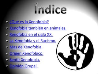 La xenofobia es un prejuicio o aversión contra los extranjeros o grupos étnicos diferentes. Se manifiesta como rechazo a los asentamientos masivos de extranjeros y puede conducir a actos violentos. Al igual que el racismo, la xenofobia promueve la segregación cultural pero acepta la asimilación de los extranjeros a la cultura local. Los factores económicos como la competencia por recursos y la crisis socioeconómica también contribuyen al aumento de la xenofobia.