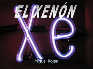 El xenón es un gas noble incoloro y pesado que se encuentra en pequeñas cantidades en la atmósfera. Fue descubierto a finales del siglo XIX y es el primer compuesto de gas noble sintetizado. Se obtiene comercialmente por extracción del aire licuado. Tiene aplicaciones como anestésico, en instalaciones nucleares y faros de automóviles debido a su peso molecular. Aunque no es tóxico, puede provocar asfixia si se inhala en grandes cantidades debido a la falta de oxígeno.