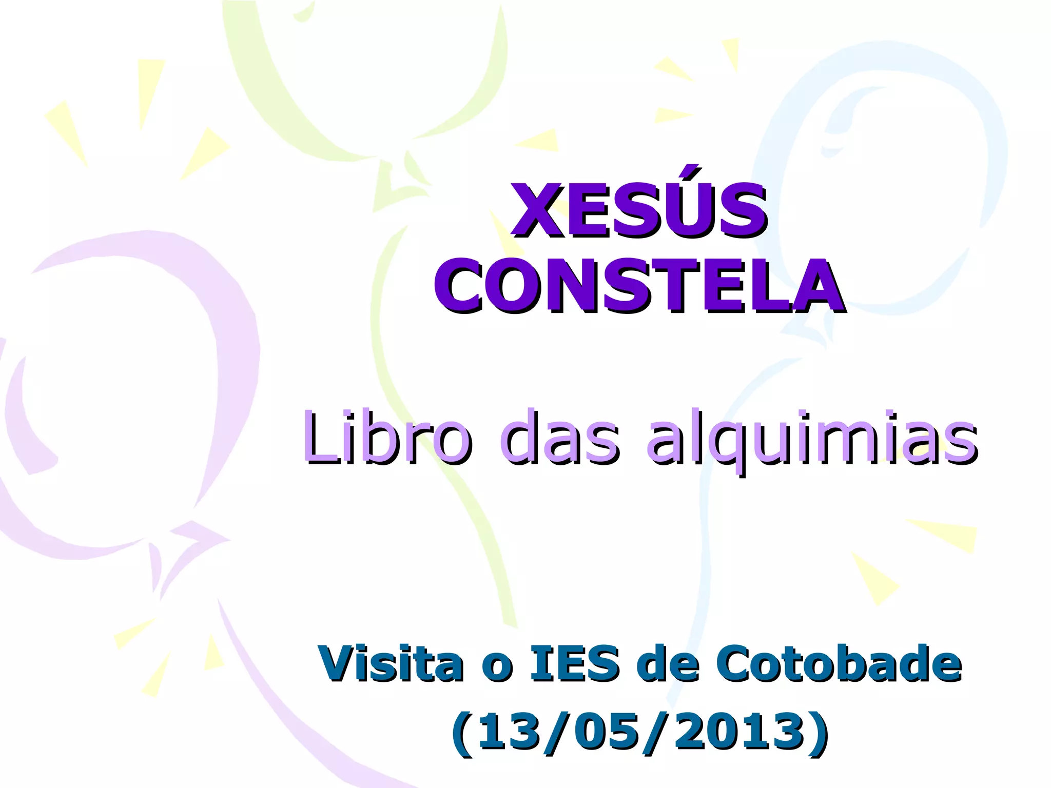 El documento habla sobre un libro de alquimias y una visita a un instituto en Cotobade el 13 de mayo de 2013.