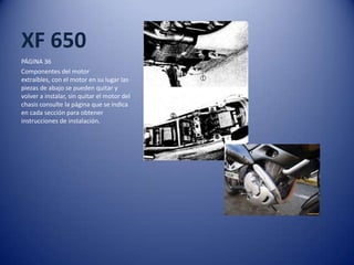 Este documento proporciona instrucciones detalladas para la remoción y reinstalación del motor de un vehículo XF 650. Describe los pasos secuenciales para quitar el motor, incluyendo componentes como el silenciador, tubos de escape, reposapiés y tapas. También explica cómo desmontar el motor para reparaciones o reemplazo de piezas, y el proceso de volver a montar y ajustar el motor correctamente.